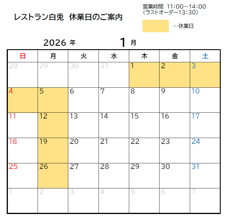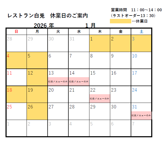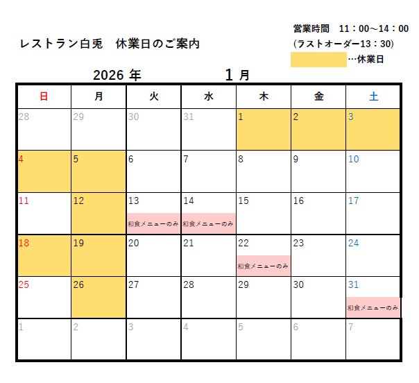 誠に恐れ入りますが12月・1月は下記カレンダーの日程でレストランを休業させていただきます。