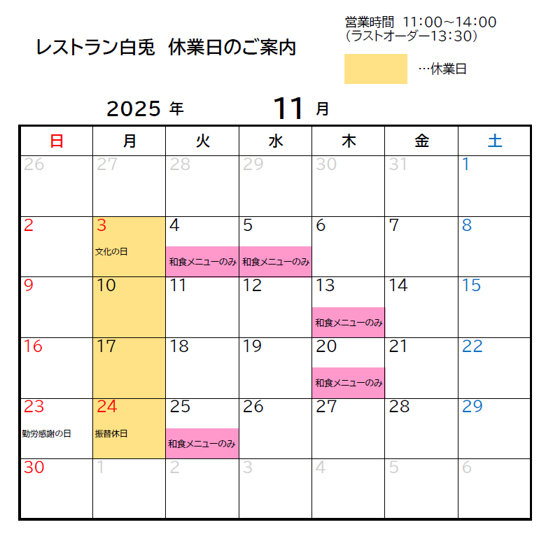 いつも白兎会館をご愛顧いただきありがとうございます。 誠に恐れ入りますが、11月は下記カレンダーの日程でレストランを休業させていただきます。 何卒ご理解の程お願い申し上げます。
